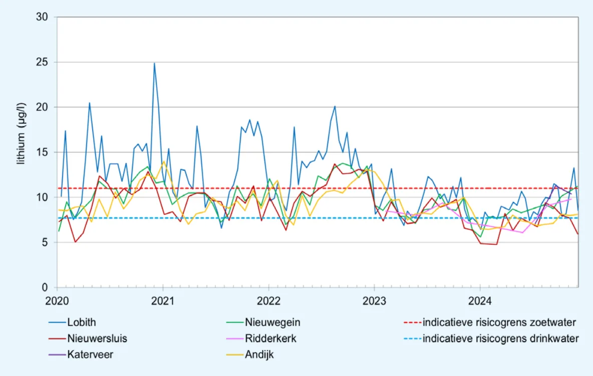 Daarvoor waarschuwt RIWA-Rijn, de vereniging van waterleidingbedrijven die Rijnwater gebruiken voor de bereiding van drinkwater. Om verhoogde concentraties te voorkomen, pleit de vereniging voor een Europese milieunorm voor lithium in oppervlaktewater. De oproep staat in het jaarrapport van RIWA-Rijn.